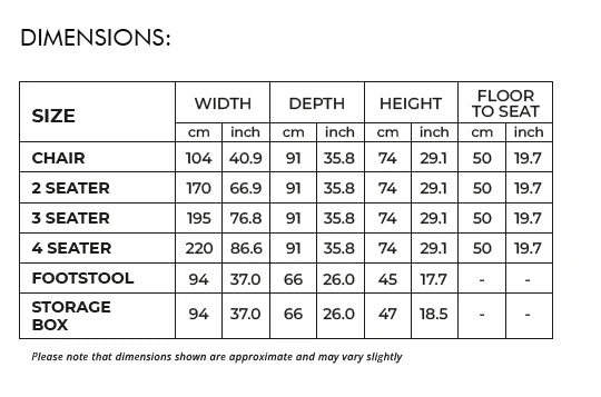 ✅ 2-Seater: 170cm (66.9″) W x 91cm (35.8″) D x 74cm (29.1″) H